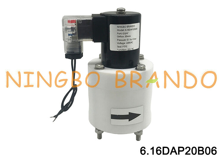 Dit is een corrosiebestendige PTFE solenoïdeklep, 3/4'' binnendraad aansluiting, 20mm doorlaat, 2/2 weg normaal gesloten, pilot zuiger bediend, 0.01 tot 0.6 MPa werkdruk, kan met EPDM, FKM of PTFE afdichting geleverd worden voor verschillende werkvloeistoffen, diverse voltages naar keuze, zoals 12VDC, 24VDC, 24VAC, 110VAC en 220VAC, etc. Het wordt gebruikt voor een breed scala aan industriële toepassingen om vloeistoffen te regelen.